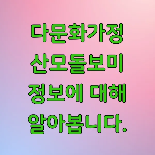 다문화가정 산모돌보미 서비스는 소득 기준 을 충족하는 다문화가정 산모를 대상으로 하며, 거주 지역의 보건소 또는 다문화가족지원센터 를 통해 신청할 수 있습니다.