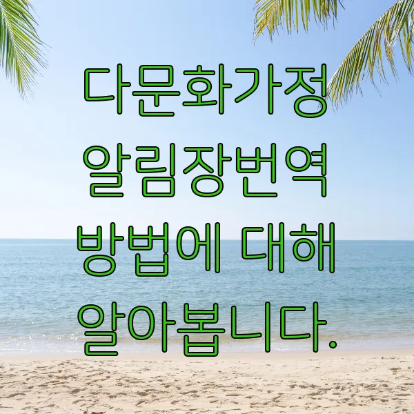 - 다문화가족지원센터: 전국 각지에 있는 다문화가족지원센터에서는 다문화가정을 위한 다양한 지원 프로그램을 운영하고 있으며, 무료 또는 저렴한 비용으로 알림장 번역 서비스를 제공하는 경우도 있습니다. 가까운 센터에 문의하여 지원 가능 여부를 확인해보세요! 다문화가족지원센터는 번역 서비스 외에도 한국어 교육, 가족 상담, 취업 지원 등 다양한 프로그램을 제공하니 적극적으로 활용해보시길 바랍니다.