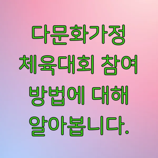 다문화가정 체육대회는 단순한 운동 경기를 넘어, 다양한 문화를 경험하고 서로 이해하며 소통하는 소중한 장입니다. 가족과 함께 참여하여 잊지 못할 추억을 만들고, 더욱 끈끈한 가족애를 느껴보시기 바랍니다!
